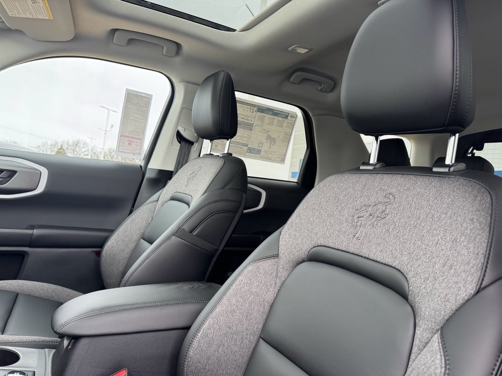 Black Appearance Package: Painted Shadow Black Roof; Cargo Mat; 17" Matte Black-Painted Aluminum Wheels; Front and Rear Floor Liners Without Carpet Mats; Liftgate with Black BRONCO SPORT Lettering; Carbon Black Grille with Black Painted BRONCO Lettering; Premium Trimmed Front Sport Contour Bucket Seats. Convenience Package: Premium Wrapped Steering Wheel; Liftgate with Black BRONCO SPORT Lettering; Front Driver/passenger Seat Back Map Pockets; Heated 8-Way Power Driver's Seat; LED Fog Lamps. Equipment Group 200A Standard Package: 8-Speed Automatic Transmission; 225/65R17 102H All-Season BSW Tires; AM/FM Stereo; 1.5L EcoBoost Engine. Power Moonroof. Front and Rear Floor Liners Without Carpet Mats. Cargo Mat. **Equipment listed is based on original vehicle build and subject to change. Please confirm the accuracy of the included equipment by calling the dealer prior to purchase.**